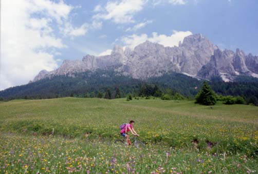 Attraversando i Prati Ronz, sotto le Pale di San Martino